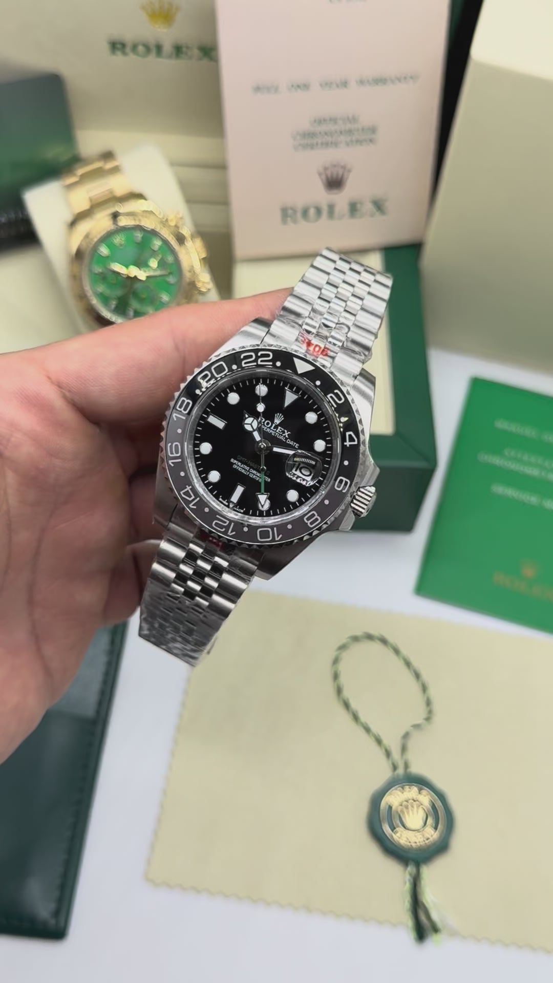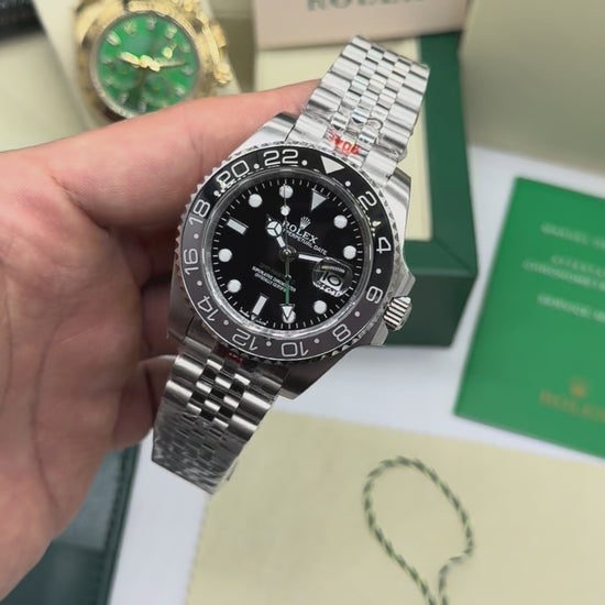 El bisel negro y gris es una opción más discreta comparada con los biseles bicolor más llamativos como el “Pepsi” o el “Batman”, mientras que la aguja GMT verde le da un toque distintivo y es un guiño a la identidad cromática de Rolex.